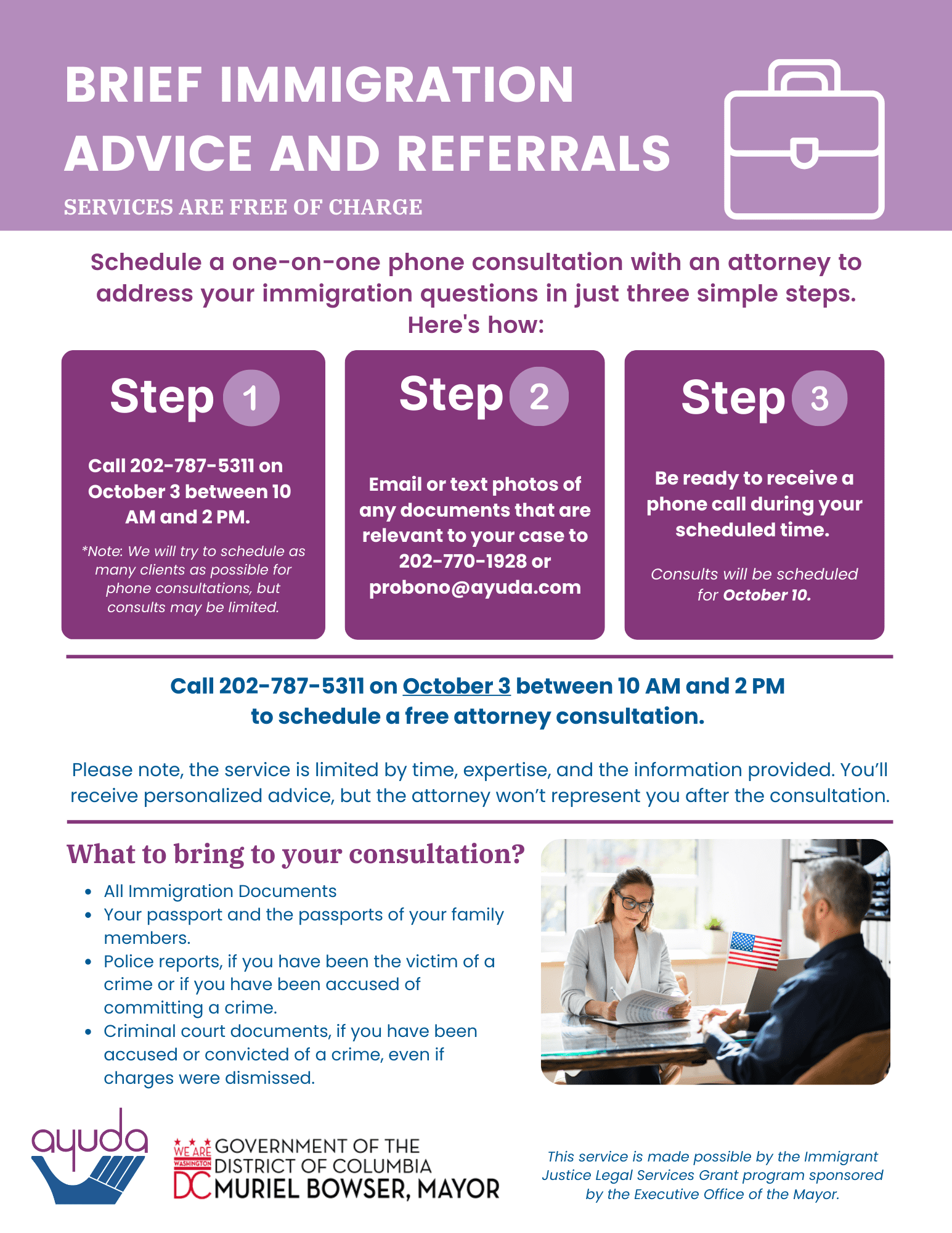 Ayuda’s immigration legal team represents low-income immigrants from all over the world in immigration matters before the Baltimore and Arlington Immigration Courts, local Juvenile and Domestic Relations Courts, the Arlington Asylum Office, U.S. Citizenship and Immigration Service, and U.S. Immigration and Customs Enforcement.